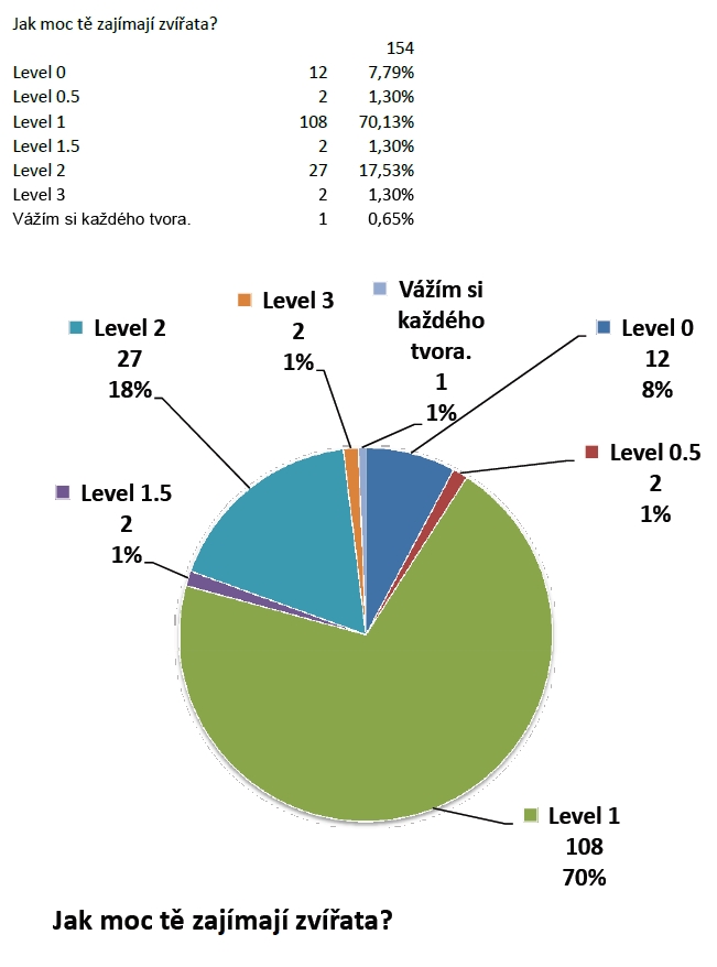 Navzdory tomu většina lidí (70%) v anketě jasně odpověděla, že jejich zájem je naprosto běžný – mají rádi svoje zvířata, ale do hloubky nejdou. Někteří se nedokázali zařadit, takže si ještě vytvořili mezistupně 0.5 a 1.5. Jeden člověk odpověděl „Vážím si každého tvora“, což jsem zase nedokázal zařadit, a tak jsem to dal bokem.