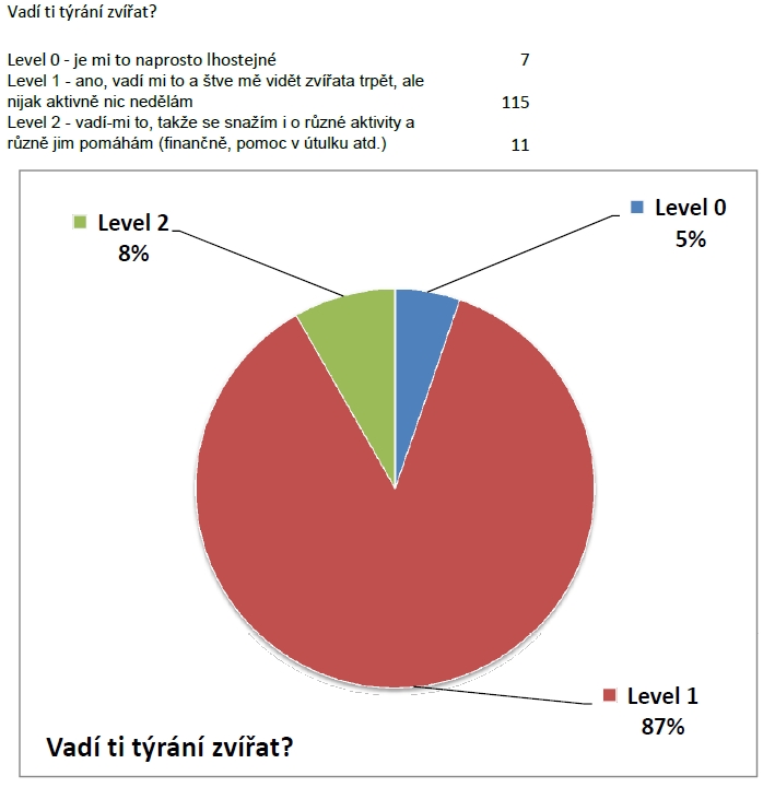 Další sekce je už vážnější, protože se věnuje týrání zvířat. Opět jsem vytvořil škálu od Level 0 do Level 2, kde člověk na Level 0 je v otázce týrání zcela lhostejný a neřeší to, až k level 2, kdy člověk nějakým způsobem aktivně bojuje proti týrání. Level 1 je pak většina lidí, kterým týrání vadí, ale nic proti němu nepodnikají. Tam spadá až 87%, což není tak překvapivé.