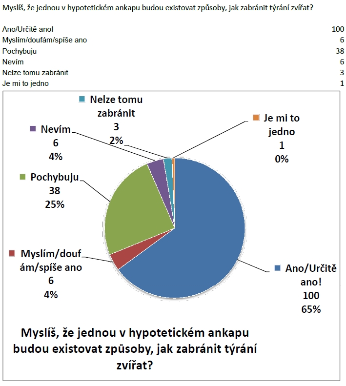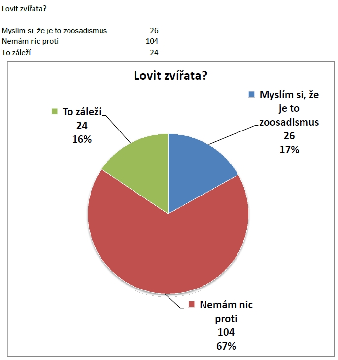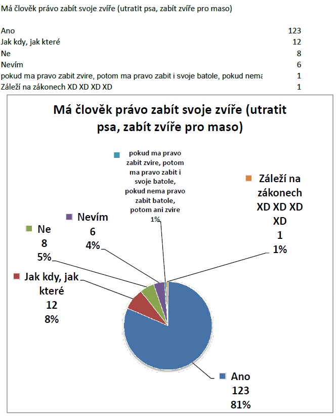 Drtivá většina respondentů si myslí, že člověk má právo zabít svoje zvíře. Uvedl jsem případy jako je utracení psa. Nechat utratit svého psa, který je třeba vážně nemocný, je lidmi vnímáno jako něco nutného. Stejně jako nemají třeba problém s tím, když zabiji prase a udělám si zabíječku.