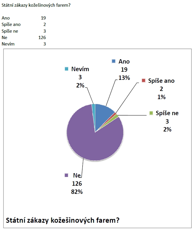 82 % je proti. Otázkou je, jestli nejsou proti jen z principu, protože cokoliv státního se nepodporuje. Někteří jsou za zákazy rádi a jedna odpověď také doslova říkala: „Sice jsem anarchokapitalista, ale dokud máme stát, tak ať pořádně kožešinovým farmám zatopí!“