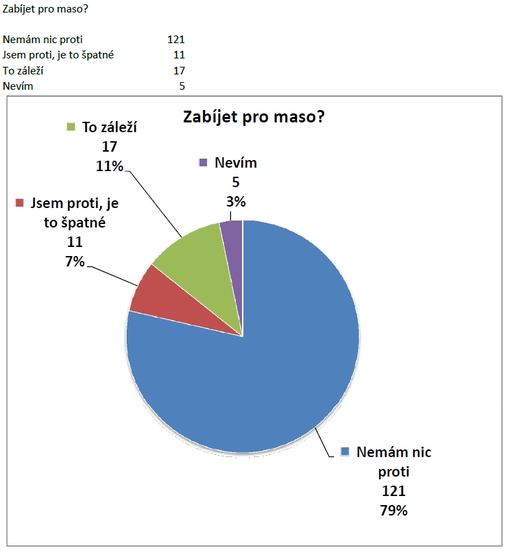 Opět většina lidí nemá nic proti zabíjení zvířat pro maso. Stejně jako v případě lovu spoustu lidí nedovedla dát jednoznačnou odpověď a popsali mi různé situace, kdy je to v pořádku, a kdy je to přes čáru. Spoustu lidí také zdůrazňovala, že zabíjet sice jo, ale rychle a bezbolestně. Opět jsem tyhle odpovědi shrnul do „to záleží“.