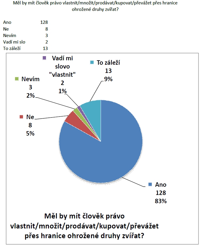 Zde je pochopitelně většina pro, protože rozumí tomu, že obchod by mohl ohroženým druhům naopak pomoct k tomu, abych jich bylo víc, což je lepší, než když je stát zakáže. Tohle je každopádně složitější téma, které by potřebovalo samostatný článek.