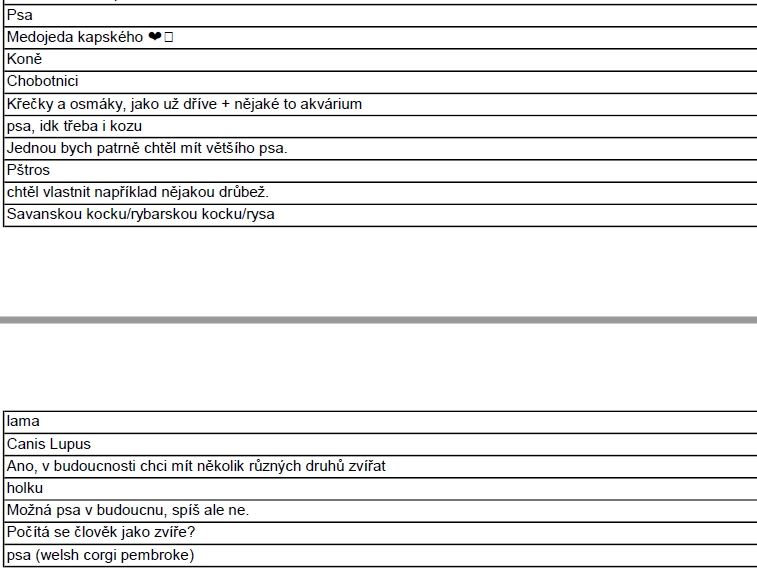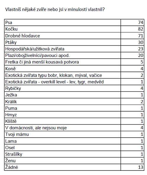 Z této otázky mám tabulku, ale ne graf. Přišlo mi to zbytečné, protože odpovědi se často překrývaly (někdo třeba vybral, že má exotická zvířata, ale zároveň, že má pumu, což může být to samé).