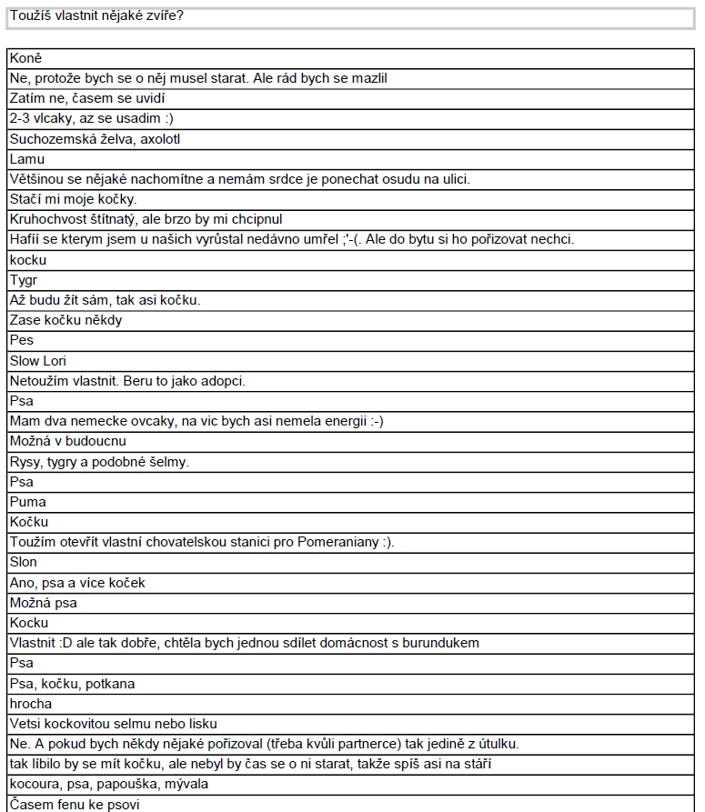 Zakomponoval jsem i tuto malou nepovinnou otázku, ale odpovědi se opět nedají zpracovat, takže to nechme jako tabulku. Promazal se z ní odpovědi „ano“, „ne“ a vulgarity, aby byla použitelnější.